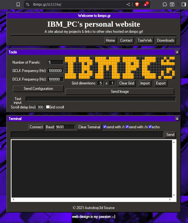 Lastly I needed a way to control the jumbotron from my pc. I looked into making a GUI with Python but in the end I decided to make a web ui and host it here. It was easy to style and add features to plus it’s always accessible from any browser with support for the SerialPort Web API (for now a Chromium exclusive) without needing to worry about dependencies, privileges, etc. To use it you can plug in the Pico, draw or import an image and click send!