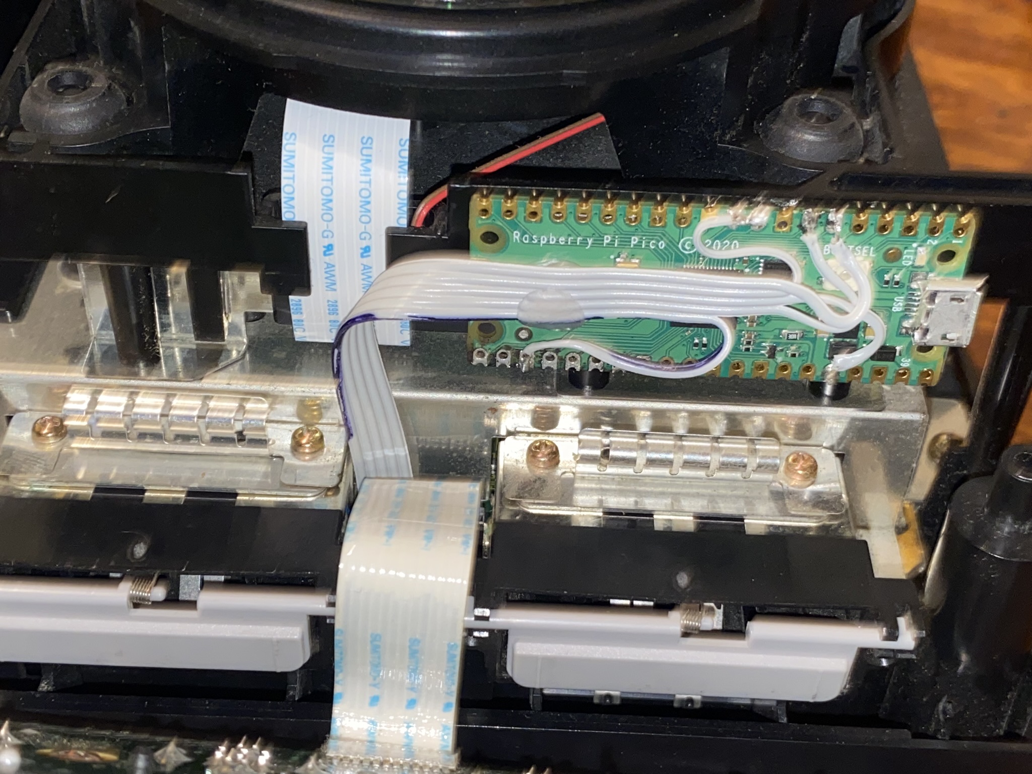 I opened the cube up, soldered some floppy drive cable to the Cube’s motherboard, stuck the Pi Pico in place with hot glue, and lastly soldered the other end of the wires to the Pico.